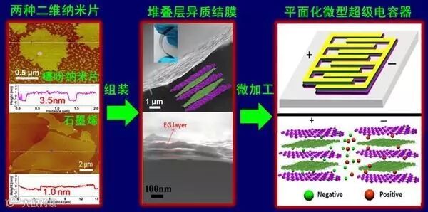 作为微纳储能器件研究领域的前沿研究方向之一,微型超级电容器不仅能够解决微型电池功率密度低、电解电容器能量密度不高的问题,而且有望作为新一代的微量能量与功率源,与微纳电子器件直接融合集成。最近,中科院大连化学物理研究所团队首次利用噻吩(TP)纳米片和电化学剥离的石墨烯(EG)制备出堆叠层异质结复合薄膜(TP/EG),并将其应用于高倍率、柔性化全固态超级电容器(TP/EG-ASSSs)和微型超级电容器(TP/EG-MSCs)。该团队发展了一种逐层真空过滤的方法,依次交替沉积电化学剥离的石墨烯纳米片和具有高氧化还原性的噻吩纳米片,先获得堆叠层异质结薄膜,再将所制备的薄膜直接转移到聚对苯二甲酸乙二醇酯柔性基底上,并用作柔性超级电容器的无粘合剂和无添加剂电极。所制成的全固态超级电容器TP/EG-ASSSs的面积比电容约为3.9 mF/cm2,体积比电容约为375 F/cm3,能量密度为13 mWh/cm3,功率密度为776 W/cm3。同时,所制成的微型超级电容器TP/EG-MSCs具有超高倍率的性能,能够在高至1000 V/s的倍率下工作。另外,这种超柔性的TP/EG-MSCs在不同的弯曲状态下都具有很稳定的电化学性能。这些柔性化、微型化超级电容器在未来的新概念、智能化电子器件显示出重要的应用前景。