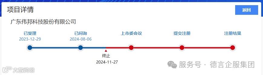 伟邦科技北交所IPO于2023年12月29日获受理,2024年8月6日进入问询阶段,2024年11月27日终止审核,共经历一轮问询且未回复。
