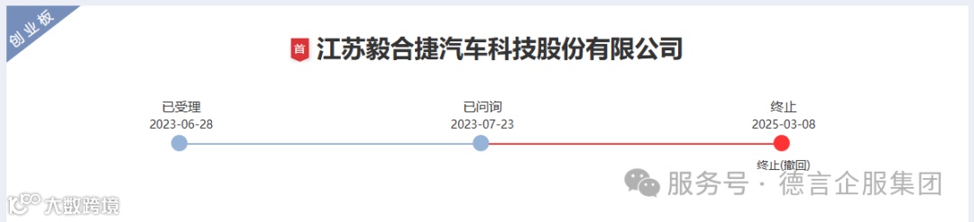 2025年3月8日,深交所披露,因江苏毅合捷汽车科技股份有限公司(以下简称“毅合捷”)及保荐机构撤回发行上市申请,决定终止其在创业板的发行上市审核。