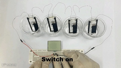 最后,研究人员通过搭建简单的串联装置,能够轻松地将输出电压提高到4.8 V,并成功地为液晶显示屏供能。