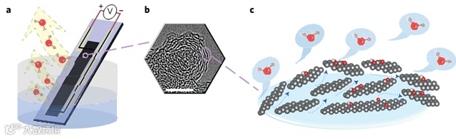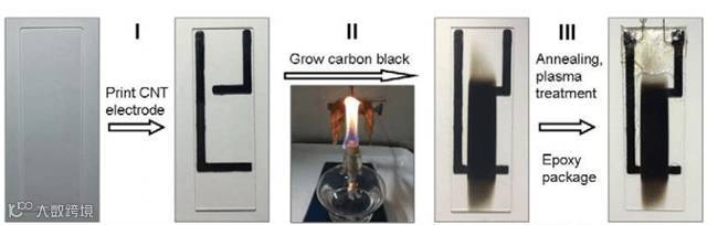 研究人员首先将由多壁碳纳米管制作的两个电极印在石英基底上,接着通过简单的乙醇火焰在两电极之间生长上碳黑片层,再经退火和等离子体处理,最后经环氧树脂包封,得到由两个多壁碳纳米管电极和碳黑片层组成的装置。