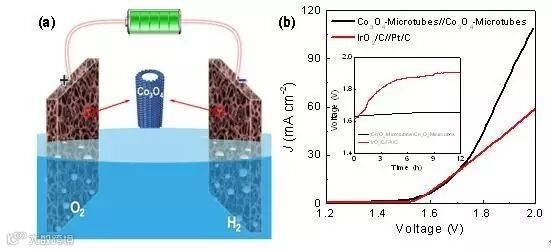 近期,澳大利亚阿德莱德大学乔世璋教授课题组开发出一种新颖快速的电化学辅助自模板法用以合成高效三维Co3O4空心管阵列电解水催化剂(上图a)。研究人员首先采用水热法将CoHPO4微米棒阵列生长到高导电的泡沫镍基底上,随后在碱电解液中,经恒电位处理将预生长的CoHPO4微米棒转变成Co3O4分级空心管。磷酸盐稳定性弱,在阳极氧化偏压能够原位逐渐转化成Co3O4;其次,CoHPO4质子化特征加速了其在碱性环境中的溶解速率,促进空心管结构的形成。该Co3O4空心管结构的高比表面积增加了材料的活性面积,多孔管壁提供了质量传递通道,而且这种三维自支撑结构有效降低了电子转移阻抗,从而提高了电子迁移效率。在电催化OER方面,起始反应电位仅为1.52 V,Tafel斜率为84 mV dev-1,甚至与IrO2/C相当;在HER反面,虽然起始反应电位略高于Pt/C,但是Tafel斜率为98 mV dec-1,明显低于Pt/C(125 mV dec-1)。进一步组合应用于全电解水反应时,仅需400 mV的过电位输出10 mA cm-2电流信号,与贵金属IrO2/C和Pt/C活性相当,但是稳定性更加优异,即使在连续12小时操作后也未出现明显活性衰退(上图b)。