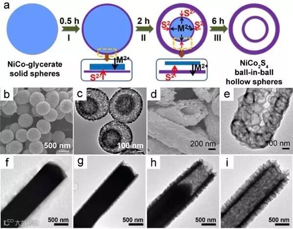 图4. (a) NiCo2S4双层空心球结构的制备过程示意图;经过氮气烧结后所获得的NiCo2S4双层空心球结构的(b) 场发射扫描电镜照片以及(c) 透射电镜照片。(d) CoS4纳米气泡中空四棱柱结构的场发射扫描电镜照片;(e) 烧结(d)中的样品后所获得的CoS2样品的透射电镜照片。制备分级NiCo-LDH四方微米管状结构的过程中,不同反应时间下所获得的中间产物的透射电镜照片:(f) 4 h,(g) 6 h,(h) 10 h以及(i) 12 h。图片来源:Acc. Chem. Res.
