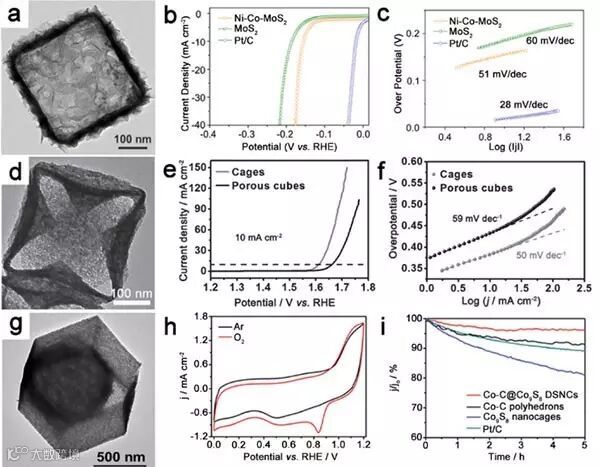 图8. Ni-Co-MoS2纳米笼状体结构的(a) 透射电镜照片以及其与纯MoS2,Pt/C电极在0.5 M H2SO4中测得的电化学析氢性能的(b) 极化曲线和(c) Tafel曲线比较。Ni-Co 基混合氧化物中空纳米立方笼状结构的(d) 透射电镜照片以及其与对应的多孔立方结构样品在1.0 M KOH中测得的电化学产氧性能的(e) 极化曲线和(f)Tafel曲线比较。Co-C@Co9S8 DSNCs的(g) 透射电镜照片以及(h) 循环伏安曲线;(i) Co-C@Co9S8 DSNCs, Co-C 多面体中空结构, Co9S8中空纳米立方体状结构以及Pt/C电极在0.1 M KOH中的电化学氧还原稳定性能比较。图片来源:Acc. Chem. Res.