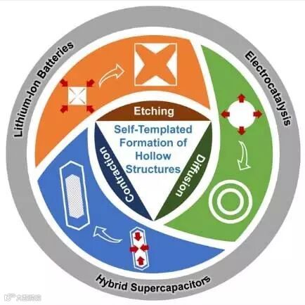 图1. 基于自模板法的中空纳米结构的合成机制分类及其在电化学能源领域的应用。图片来源:Acc. Chem. Res.