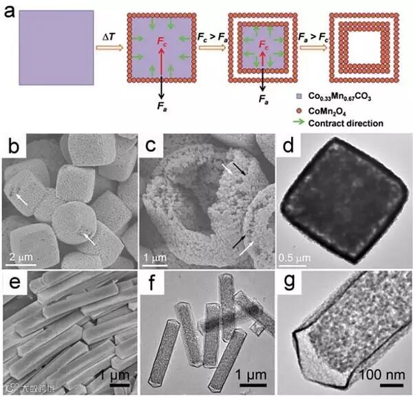 图5. (a) 双层CoMn2O4中空微米立方体结构的制备过程示意图。所制备的双层CoMn2O4中空微米立方体结构的(b,c) 场发射扫描电镜照片以及(d) 透射电镜照片。多孔Ni-Co基氧化物四方棱柱结构的(e) 场发射扫描电镜照片以及(f,g) 透射电镜照片。图片来源:Acc. Chem. Res.