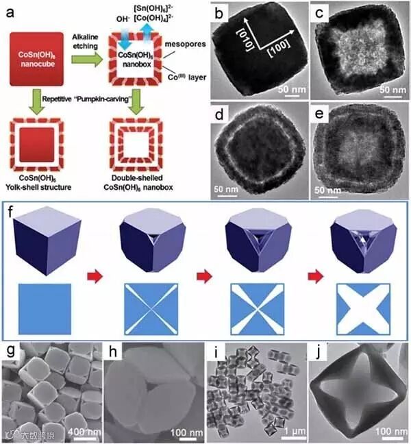 图2. (a) CoSn(OH)6中空纳米箱体结构合成过程示意图。所制备的具有不同结构的CoSn(OH)6样品:(b) 实心纳米立方体结构,(c) 单层纳米箱体结构,(d) 核-壳中空纳米箱体结构,(e) 双层中空纳米箱体结构。(f) Ni-Co PBA立方中空笼状结构合成过程示意图及其(g-j)形貌表征。图片来源:Acc. Chem. Res.