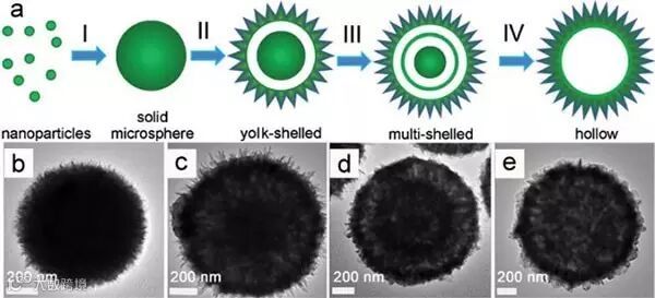 自模板法的关键在于模板内部空间结构的形成。依据内部中空结构的成形机理,自模板法可大致分为三种合成机制,即选择性刻蚀法、向外扩散法以及非均匀收缩法。在选择性刻蚀法过程中,中空结构的形成来源于模板内部区域的选择性刻蚀。通常来说,基于此种机制所得到的中空结构会保持原模板的外形尺寸及晶体特征。对于向外扩散法机制而言,模板内部物质自内向外的迁移扩散导致了中空结构的形成。在此种机制中,中空结构的演变过程通常伴随着颗粒在溶液中的生长及转化。在非均匀收缩机制中,中空结构的形成来源于热处理过程中模板跟产物之间巨大的质量或体积差异从而导致的模板由外向内的体积收缩。当然,还有一些不属于上述三种合成机理的自模板法,最为典型的是电偶置换反应法制备金属中空结构。这种方法基于模板与溶液金属离子间的电化学氧化还原反应,引导溶液中的金属在模板表面成核生长,同时造成内部模板刻蚀形成空心结构。