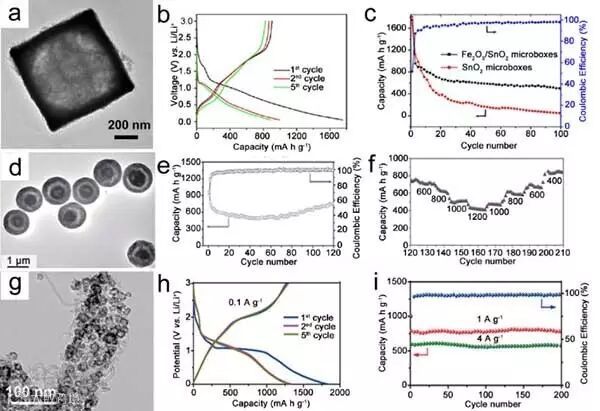 图6. Fe2O3/SnO2纳米中空立方体结构的(a) 透射电镜照片以及(b) 充电/放电电压分布曲线;(c) Fe2O3/SnO2纳米中空立方体结构与SnO2纳米中空立方体结构在200 mA g-1电流下的循环性能比较。ZnMn2O4双层中空结构微米球的(d) 透射电镜照片以及(e) 在400 mA g-1电流下的循环性能;(f) 经过图(e)中所示的循环性能测试后的同一个电池在不同电流密度下的速率性能,图中电流密度的单位为mA g-1。分级CNT/Co3O4微米管状结构的(g) 透射电镜照片,(h) 充电/放电电压分布曲线以及(i) 循环性能曲线。图片来源:Acc. Chem. Res.
