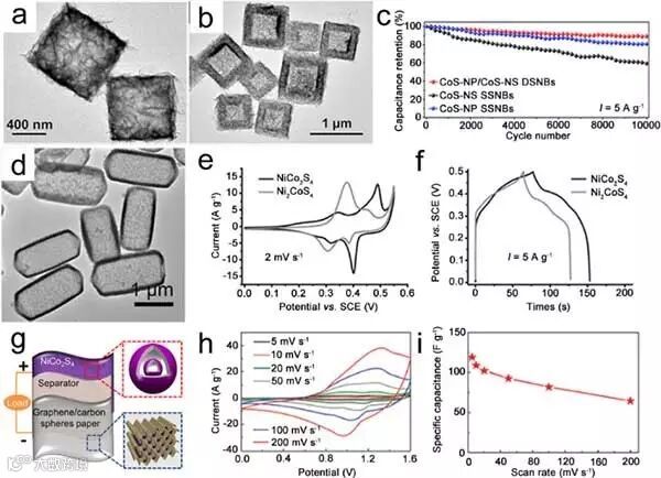 图7. (a) CoS-NS SSNBs 和 (b) CoS-NP/CoS-NS DSNBs的透射电镜照片;(c) 三种不同的CoS中空纳米结构在同一电流密度下的循环性能比较。(d) Ni2CoS4 中空四方棱柱结构的透射电镜照片;NiCo2S4和Ni2CoS4两种中空四方棱柱结构的(e) 循环伏安曲线以及(f) 恒电流充电/放电电压分布曲线比较。NiCo2S4/G/CS HSC 装置的(g) 结构示意图,(h) 循环伏安曲线以及(i) 比电容容量随扫描速率变化的曲线。图片来源:Acc. Chem. Res.