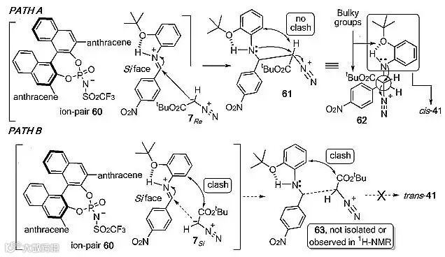 作者根据实验结果,提出了如下的反应机理(图9)。首先催化剂活化亚胺形成离子对,然后重氮乙酸叔丁酯从亚胺正离子位阻小的Si面进攻更为有利,这样得到的就是手性的顺式产物,如果从亚胺正离子的Re面进攻的话,位阻较大,从能量上讲是不利的。
