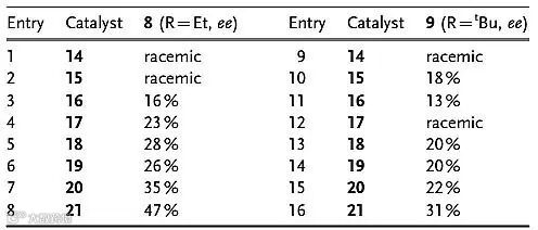作者随后对更多的催化剂进行了筛选,最终催化剂21脱颖而出,分别以47%和31%的对映选择性得到产物8和9(图4)。
