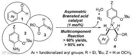 Sean P. Bew博士等人报道了手性磷酰亚胺Brønsted酸催化的不对称aza-Darzens反应,该方法可以实现三组分的一锅法反应,高效构建了手性顺式的吖丙啶类化合物。研究人员进行了氯霉素的合成,更有力证实了该方法的实用性。