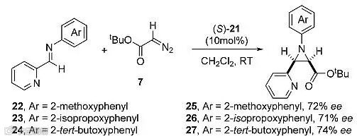 作者继续用更加刚性的N-芳基亚胺取代柔性的N-苄基亚胺考察该反应,同样使用21作为催化剂,产物的对映选择性得到了较大的提升。2-叔丁氧基苯胺衍生的亚胺能以74%的对映选择性得到产物(图5)。作者随后对其它反应条件如溶剂温度进行了考察,当使用氯仿作为溶剂,1%的21作为催化剂,于-60 ℃下反应,以95%产率和98%的对映选择性得到产物27。