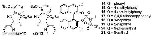 作者随后使用酸性更强的催化剂磷酰亚胺14、15和16,顺利地以73-87%的产率得到顺式产物8,粗产品核磁共振测试显示反应过程中没有烯胺和反式产物的生成(图3)。然而,使用催化剂14和15得到的产物是消旋的,催化剂16得到的产物只有16%的对映选择性。