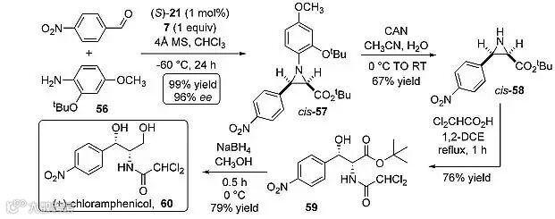 为了证明该反应的实用性,作者进行了衍生化实验。首先是三组分一锅法反应以99%的产率和96%的对映选择性得到顺式产物57,产物57在CAN的参与下发生氧化消除保护基得到顺式产物58,产物58在二氯乙酸的参与下发生开环反应得到氨基醇化合物59,产物59随后发生还原反应得到氯霉素60(图8)。