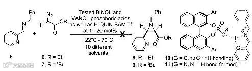 本文作者曾经报道过消旋的顺式手性吖丙啶的合成,但当其尝试使用手性磷酸催化来实现手性合成却失败了(图2)。作者猜想失败原因在于磷酸较弱的酸性使其不能有效活化亚胺5。