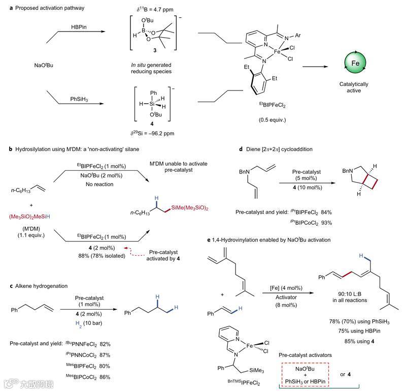 在完成反应性的研究后,作者开始考察NaOtBu活化该反应的机制。开始时,作者认为活化模式同以往报道的格氏试剂活化铁或钴催化剂类似,是经由配体交换生成[M(OtBu)2],然而该物种很难理解继续发生还原消除生成低价金属。尽管如此,作者还是考虑可能经由β-消除得到[M-CH3]物种,而后催化反应。但后续的核磁实验证明并非如此。于是,作者考虑NaOtBu可能是与HBPin或PhSiH3作用生成Ate盐,而这一结果也得到了13B谱和29Si的确认。Ate盐可提供H-,与催化剂作用生成[MH2]物种,而后还原消除得到有活性的低价金属催化剂(Scheme 4a)。为了验证了Ate盐的活化模式,作者随后做了一系列的催化实验。正常实验中“不成功”的底物在使用Ate盐4和铁催化剂前体下,可以获得78%的收率(Scheme 4b)。烯烃的氢化和二烯的[2+2]反应也能顺利实现(Scheme 4c&d)。而原位生成的催化剂与制备好的ate盐4可以取得相当的结果,说明了Ate盐4是可以被广泛使用的活化试剂(Scheme 4e)。