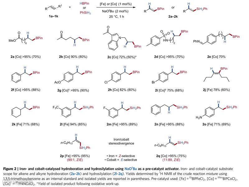 随后,作者在分别使用HBpin和PhSiH3作硼氢化试剂和硅氢化试剂条件下,对烯烃/炔烃的底物适用范围进行了考察(Scheme 3)。可以看出,底物的适用范围广,硼氢化(2a-2k)、硅氢化(2l-2q)都获得很好的结果,反应产率高,位置选择性和立体选择性都很好。反应均使用NaOtBu作活化试剂,钴或铁的选择根据底物而定。