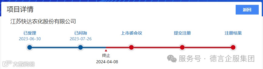 2024年4月12日,北交所公告,因江苏快达农化股份有限公司(以下简称“快达农化”)撤回发行上市申请,根据相关规定,终止其首次公开发行股票并在北交所上市审核。