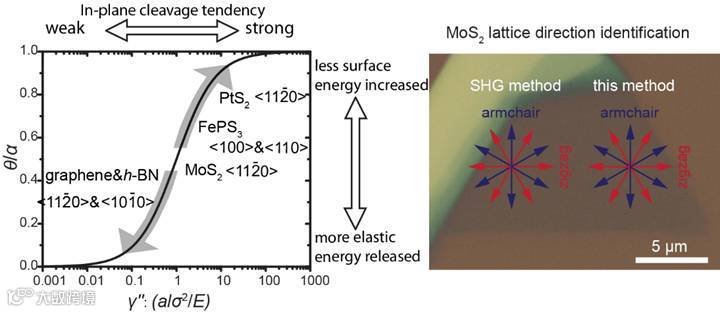 该发现的重要之处在于为判断机械剥离二维材料晶格方向提供依据。省去了使用激光或者透射电子显微镜相关方法判断的繁琐,仅仅使用光学显微镜就可在数秒之内快速而准确的判断出机械剥离的二维度材料的晶格方向。与second harmonic generation(SHG)方法相比,该方法不再受对称性的约束而要求材料层数一定是奇数,只需要材料有较强的剥离方向倾向。研究人员利用这一现象判断的单层MoS2的晶格方向,与SHG方法判断的结果非常一致。