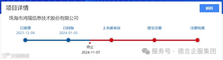 2024年11月29日,北交所公告,因珠海市鸿瑞信息技术股份有限公司(以下简称“珠海鸿瑞”)撤回发行上市申请,根据相关规定,终止其首次公开发行股票并在北交所上市审核。