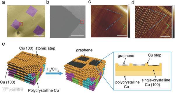 石墨烯是由单层碳原子以sp2杂化而成的蜂窝状二维原子晶体,自2004年被发现以来,以其独特的能带结构和优异的光学、电学等性质成为了新一代明星材料1。各行各业的研究人员也在如火如荼地开展各种有关石墨烯性质和应用的研究,期望发挥石墨烯杀手锏式的作用。然而,石墨烯的高效利用必须依托其高效、规模化的制备方法。目前,以铜箔为基底的化学气相沉积方法(CVD)因其具备大面积、低成本等优势成为了当前制备石墨烯的主流方法之一 2。然而,多晶铜箔表面的高密度台阶,晶界,缺陷以及较大的粗糙度均降低了石墨烯的成核势垒,从而导致石墨烯随机成核的概率急剧增加,随之引起石墨烯的畴区尺寸受到限制,最终这些取向不一致的微小石墨烯畴区会拼接而成具有高密度晶界的石墨烯薄膜3。研究发现,晶界的存在会大大降低石墨烯的电学和机械等性质4,从而严重限制了石墨烯的应用。因而,如何增加石墨烯的单晶畴区尺寸是铜箔上石墨烯CVD生长所面临的主要挑战之一。