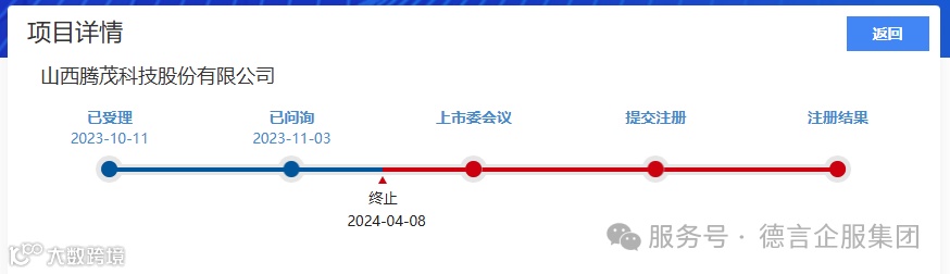 2024年4月18日,北交所公告,因山西腾茂科技股份有限公司(以下简称“腾茂科技”)撤回发行上市申请,根据相关规定,终止其首次公开发行股票并在北交所上市审核。