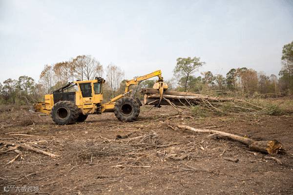在巨大的轰鸣声中,令人不寒而栗的巨型伐木机将一棵棵巨树推倒,再切割成一段段木料。剩下来的那些枝枝桠桠,连同一些小树,则被处理成木质颗粒,飘洋过海送到英国,用作火力发电的燃料。