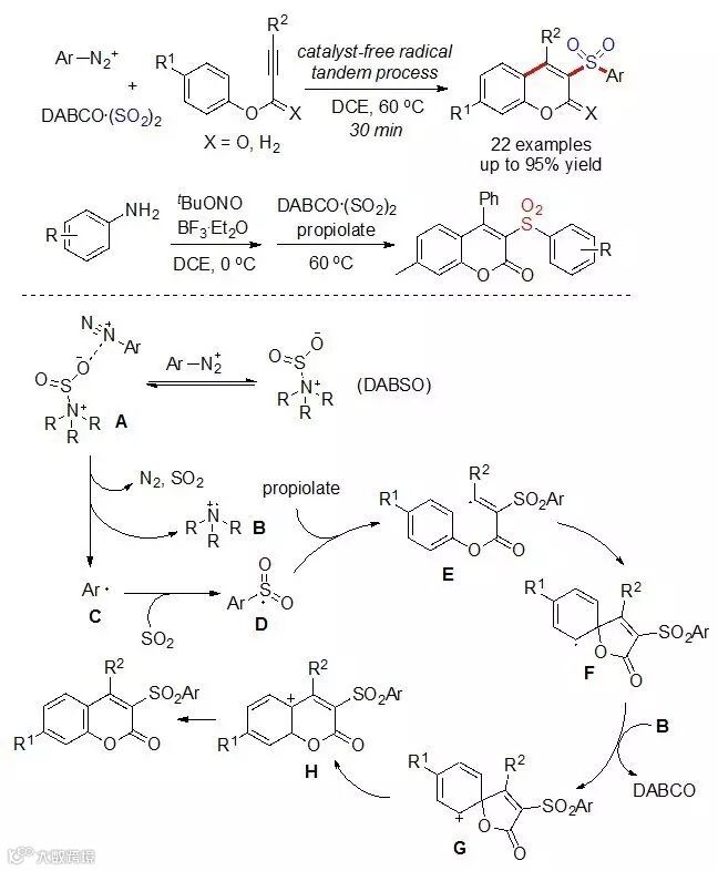芳基磺酰基自由基对于一些不饱和键如双键三建的加成及其串联反应是构建砜类衍生物的重要方式之一。主要产生芳基磺酰基自由基的方式有磺酰基卤化物在引发剂或者光照条件下生成,或者通过亚磺酸、亚磺酸盐或者磺酰肼在氧化条件下生成。这些反应依然是基于已有的磺酰类化合物进行转化,同样无法摆脱传统合成这些化合物的缺陷。2014年,复旦大学吴劼教授课题组报道了一例通过芳基重氮盐与DABCO.(SO2)2和肼三组分在无金属催化剂条件下生成芳基磺酰肼的反应,实现了通过自由基过程利用二氧化硫插入策略进行磺胺类化合物的合成(Angew. Chem. Int. Ed., 2014, 53, 2451),作者提出了一个肼参与的磺酰基自由基的产生途径。为了解决底物的局限性,该课题组在通过自由基过程进行二氧化硫插入方面进行了大量尝试,并相继取得了一些进展。最近,该小组发现,在无需肼的存在下,芳基重氮盐与DABCO.(SO2)2就能在无催化剂及无添加剂的存在下高效生成芳基磺酰基自由基,生成的磺酰基自由基可以进一步运用到3-磺酰基香豆素的合成中(Angew. Chem. Int. Ed., 2016, 55, 11925)。