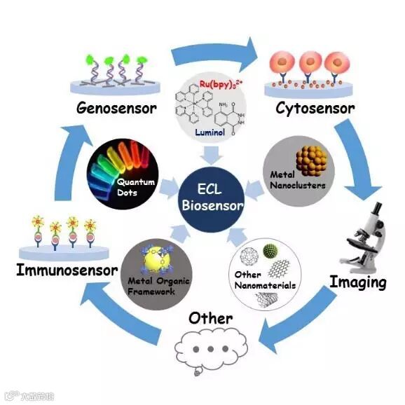 电致化学发光(Electrochemiluminescence,简称ECL)是指利用电极提供能量直接使电极表面发光物进行氧化还原反应而形成激发态,并由激发态返回到基态所产生的发光现象。ECL是将化学发光与电化学技术相结合的一种分析方法,极大地引起了研究者的兴趣,并逐渐成为分析领域的重要分支。