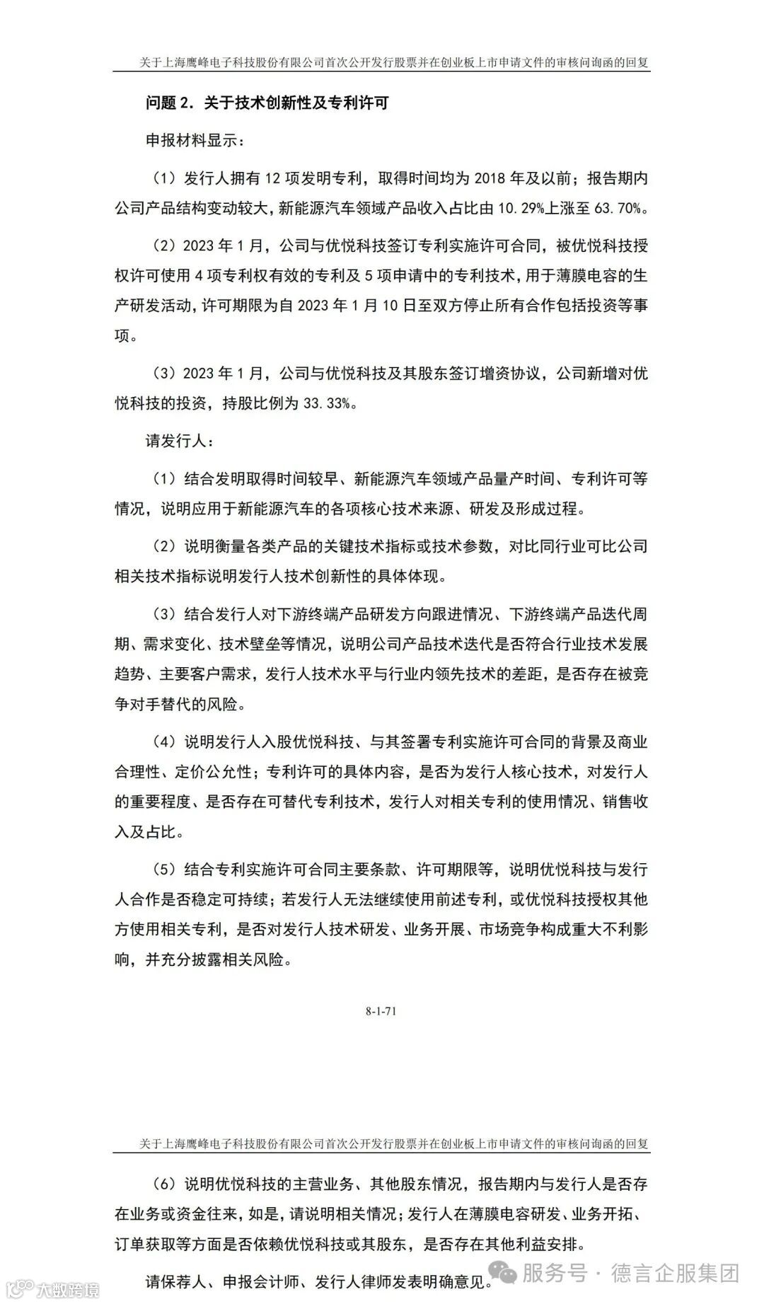 本次鹰峰电子IPO进程中审核问询问题中知识产权方面的主要问询点1为【技术创新性】,上市委在首轮问询中重点问询了: