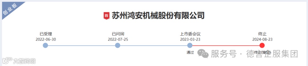 2024年8月23日,深交所公告,因苏州鸿安机械股份有限公司(以下简称“鸿安机械”)撤回发行上市申请,根据相关规定,终止其首次公开发行股票并在创业板上市审核。