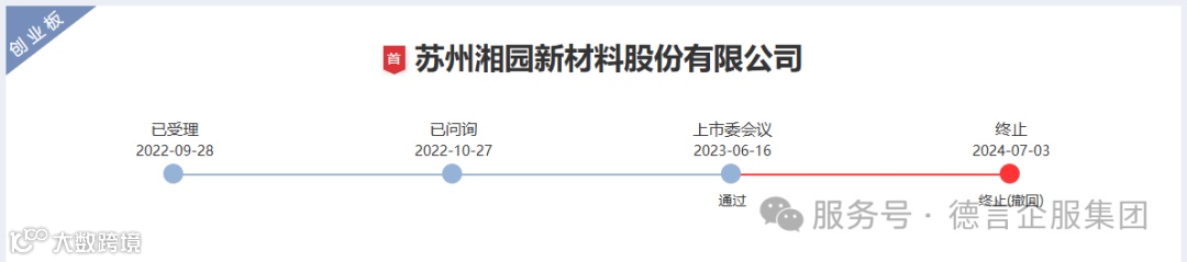 2024年7月3日,深交所公告,因苏州湘园新材料股份有限公司(以下简称“湘园新材”)撤回发行上市申请,根据相关规定,终止其首次公开发行股票并在创业板上市审核。