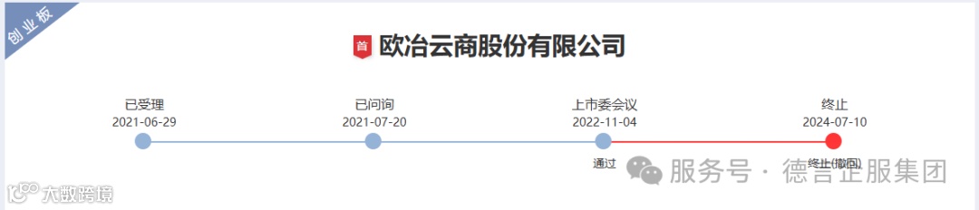 2024年7月10日,深交所公告,因欧冶云商股份有限公司(以下简称“欧冶云商”)撤回发行上市申请,根据相关规定,终止其首次公开发行股票并在创业板上市审核。