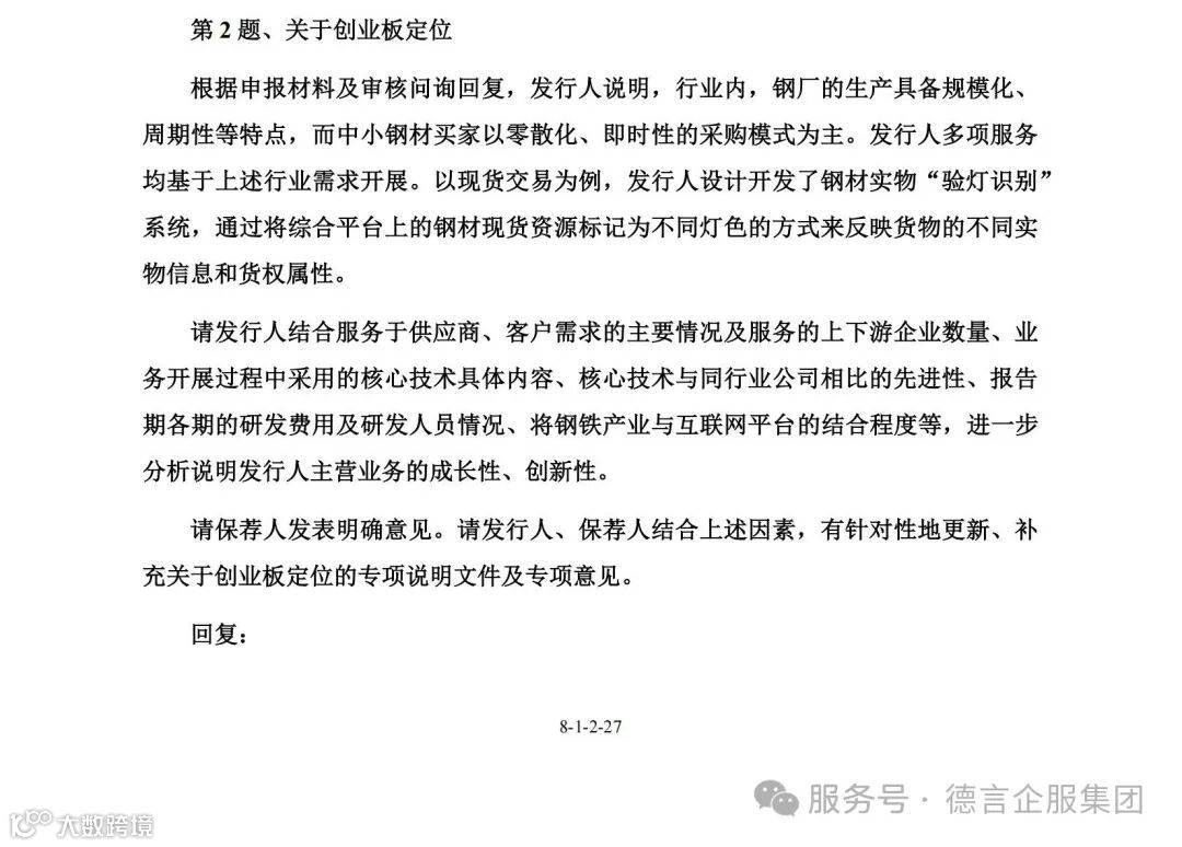 本次欧冶云商IPO进程中审核问询问题中知识产权方面的主要问询点1为【创业板定位】,上市委在二轮问询中重点问询了: