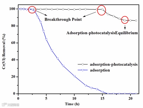 采用这一体系,发现30 min内,TiO2-rGH对低浓度(5 mg/L)Cr(VI)可100%去除,对高浓度(200 mg/L)Cr(VI)的去除率也在85%以上。同时,TiO2-rGH复合水凝胶具有特殊的宏观三维网状结构,可实现快速分离回收,石墨烯的面吸附特点可实现快速的吸附与脱附,提高了材料的快速再生能力。在流动体系中,复合水凝胶可持续15 h以上对Cr(VI)的连续去除,吸附-光催化平衡后去除能力保持在86%以上。体现了TiO2-rGH良好的吸附-光催化行为,克服了吸附材料易饱和及光催化处理能力低等问题。