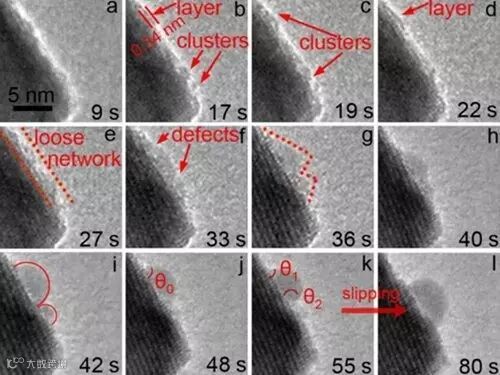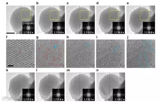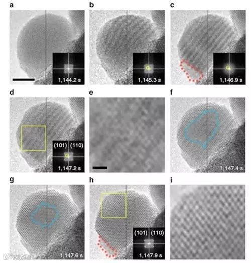 图1. 纳米液滴成核过程中不同阶段的原位高分辨透射电镜照片