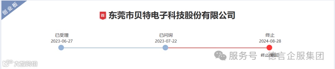 2024年8月28日,深交所公告,因东莞市贝特电子科技股份有限公司(以下简称“贝特电子”)撤回发行上市申请,根据相关规定,终止其首次公开发行股票并在创业板上市审核。