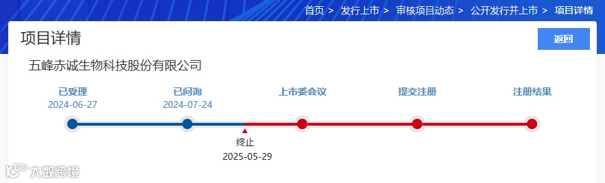 2025年5月30日,北交所披露,因五峰赤诚生物科技股份有限公司(以下简称“赤诚生物”)及保荐机构撤回发行上市申请,决定终止其在北交所的发行上市审核。