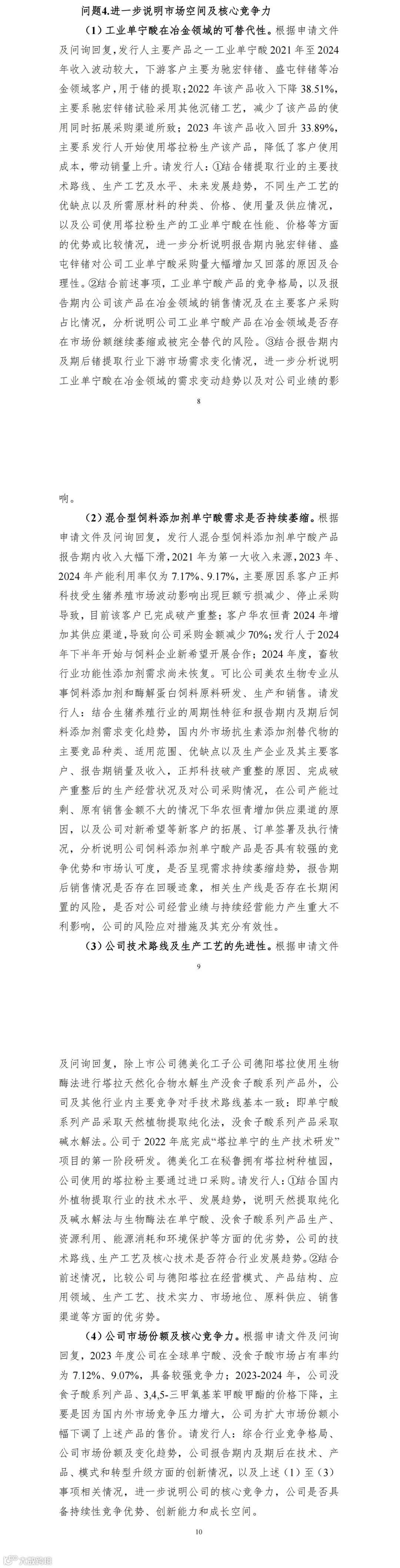 (3)公司技术路线及生产工艺的先进性。根据申请文件及问询回复,除上市公司德美化工子公司德阳塔拉使用生物酶法进行塔拉天然化合物水解生产没食子酸系列产品外,公司及其他行业内主要竞争对手技术路线基本一致:即单宁酸