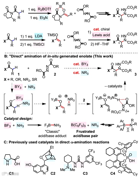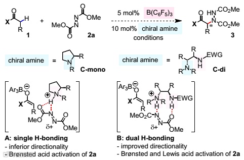 手性含氮化合物常通过羰基类化合物与偶氮化合物、亚硝基化合物和氧杂吖丙啶等化合物的加成反应来构建,根据亲核试剂是否预活化还可分为直接胺化和间接胺化两类。最近十几年随着有机双官能团小分子催化剂的蓬勃发展,手性碳氮键的构建也越来越多样化和高效化。虽然这些催化剂对高活性的α-羰基化合物具有很好的催化活性,但对于未活化的羰基化合物却表现出很低的催化活性。随后,Stephan等人开创了“受阻路易斯酸碱对”(Frustrated Lewis Pairs,FLPs)的概念,可是由于立体位阻原因,离子对结合的不是很牢固,到目前为止,FLPs催化的手性版本还仅局限于氢化或硅氢化反应。正是在这样一个背景下,来自美国波士顿学院的Masayuki Wasa博士等人发现了由强路易斯酸B(C6F5)3和大位阻的碱PMP(1,2,2,6,6-五甲基哌啶)组成的FLPs类型催化剂,成功实现了未活化的羰基化合物和偶氮化合物的胺化反应(Scheme 1)。相关论文发表于J. Am. Chem. Soc.,第一作者为Wasa组博后、毕业于上海有机所的商明(Ming Shang)博士。