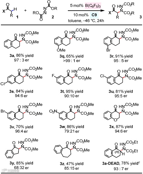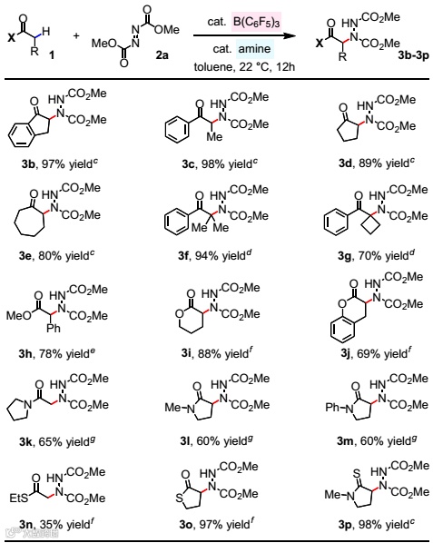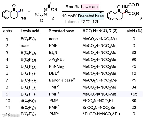 作者首先选择苯并环己酮1a和偶氮化合物2作为底物对条件进行了筛选。从结果可以看出只使用路易斯酸B(C6F5)3或碱PMP作为催化剂,该反应都不能有效发生。只有酸碱同时存在时,才能顺利得到产物3。作者筛选了一系列的有机碱,PMP表现出最高的催化活性,以大于95%的产率得到目标产物。偶氮化合物的酯基取代基部分位阻越大,产率越低,当使用偶氮二叔丁酯作为氮源时,该反应不能顺利进行。最终的最佳反应条件是:B(C6F5)3作酸,PMP作碱,甲苯作溶剂于22 ℃下反应(Table 1)。
