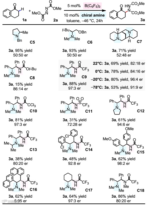 作者选择底物1a和2a对手性胺部分进行了筛选,从结果可以看出,单胺催化剂基本上没有手性选择性,而双胺催化剂呈现出较好的选择性。经过一系列筛选,有机小分子催化剂C9脱引而出,以97/3的er值得到产物3a。从筛选过程可以看出,该反应对温度有非常大的依赖性。温度太高或太低对产物的对映选择性都不利。最终最佳的反应条件是:B(C6F5)3作酸,C9作碱,甲苯作溶剂于-46 ℃下反应24小时(Table 3)。