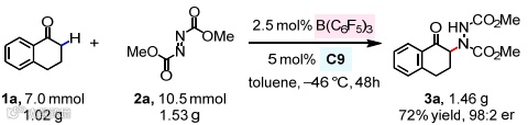 本文作者发现了B(C6F5)3/有机碱催化体系,高效催化未活化羰基化合物与偶氮化合物的加成反应,以高产率和高对映选择性得到目标产物。此外,该反应的克级制备也表明其具有较广泛的应用前景。总之,该催化反应极大丰富了路易斯酸碱对的催化模式。