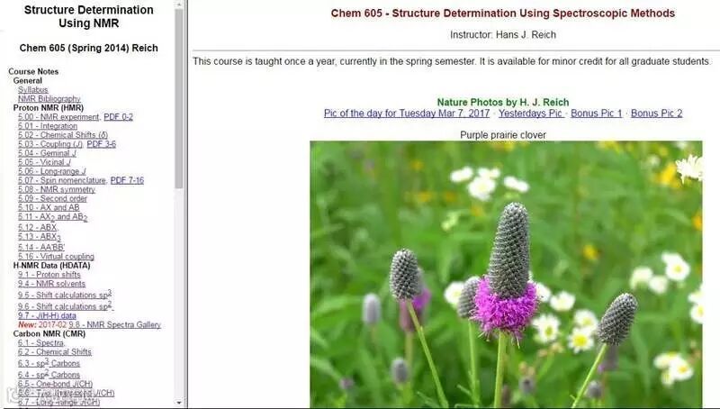 Reich教授提供了一整套非常完备、实用的核磁教程,具体的网址见本文最后。进入该网页可以发现这样的界面(图片是人家定期更换的,大家很可能看到的不是下面这个)。