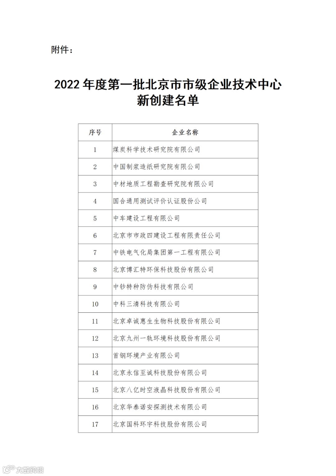 市企业技术中心建设管理办法(2021版)》(京经信发〔2021〕72号)和《北京市企业技术中心建设管理实施细则》(2021版)的有关规定,组织了2022年度第一批北京市企业技术中心新创建工作,前期已将拟通过名单予以公示,期间未收到异议,现将2022年度第一批新创建的北京市市级企业技术中心名单予以正式公布。
