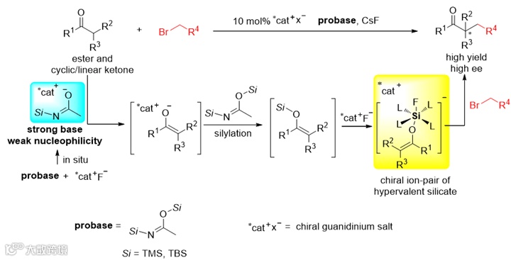 他们的策略是通过活化一个潜在碱(probase)原位产生大位阻强碱,然后强碱在手性催化剂的控制下促进反应的完成。比较有趣的是,在研究反应的过程中,作者发现有烯醇硅醚类化合物生成。通过一系列验证机理实验,最终确定了手性高价硅离子对(chiral silicate ion pair)是整个反应中真正的活性中间体。