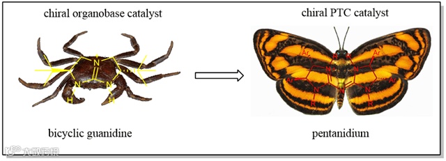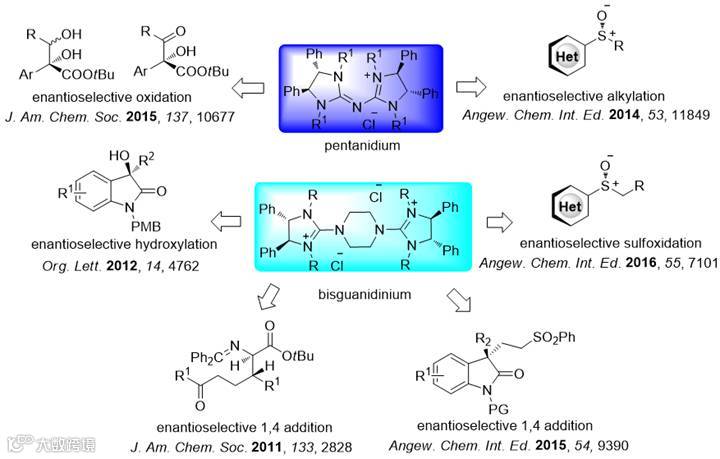 在2011年,陈俊丰课题组基于胍的共轭结构设计出一种手性胍盐(Pentanidium and Bisguanidinium)做为全新的一类手性不对称相转移催化剂(图2)。不同于传统的sp3季铵盐相转移催化剂,胍盐具有sp2共轭结构,所以具有不同的催化活性。