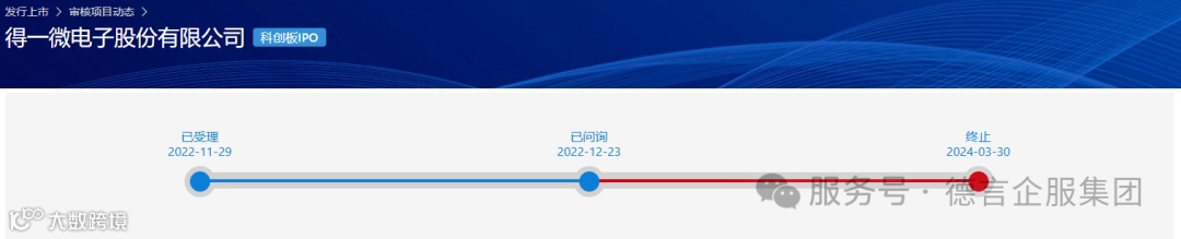 2024年3月30日,上交所公告,因得一微电子股份有限公司(以下简称“得一微”)撤回发行上市申请,根据相关规定,终止其首次公开发行股票并在科创板上市审核。